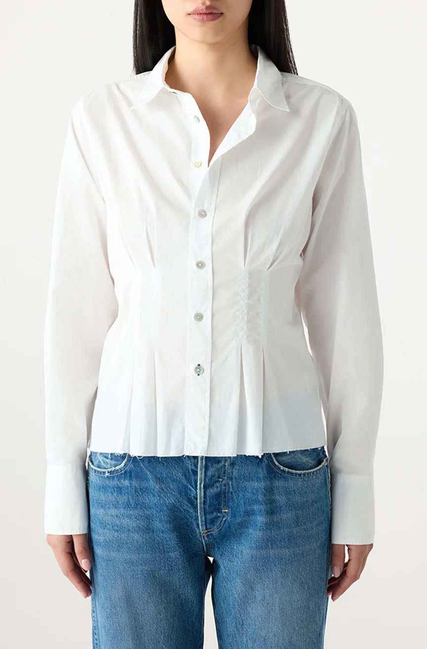 A decidedly feminine take on the classic poplin shirt, with waist pleats and a cinched back for a flattering silhouette.