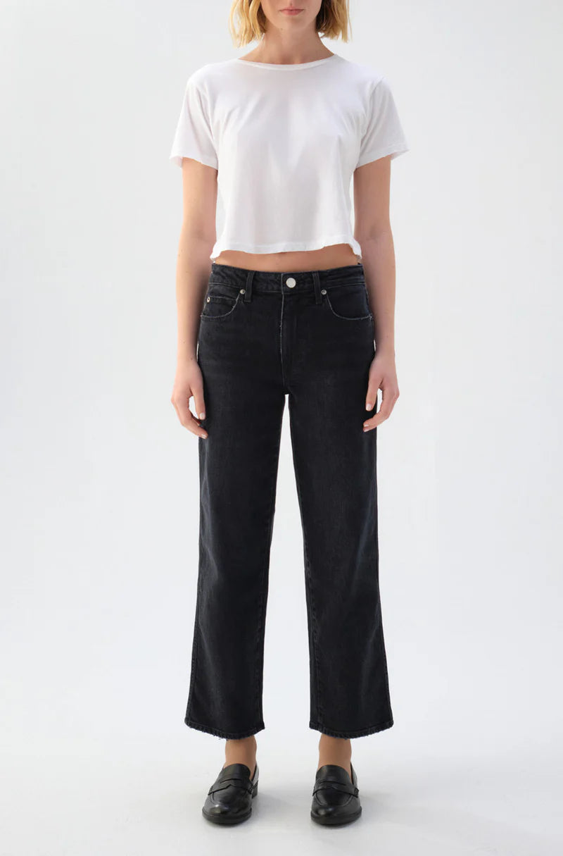This cropped, wide straight leg is the easiest fit yet. With a mid rise, this pair is meant to sit low on the hips for a relaxed look. Thoughtful distressing throughout. Zip fly.