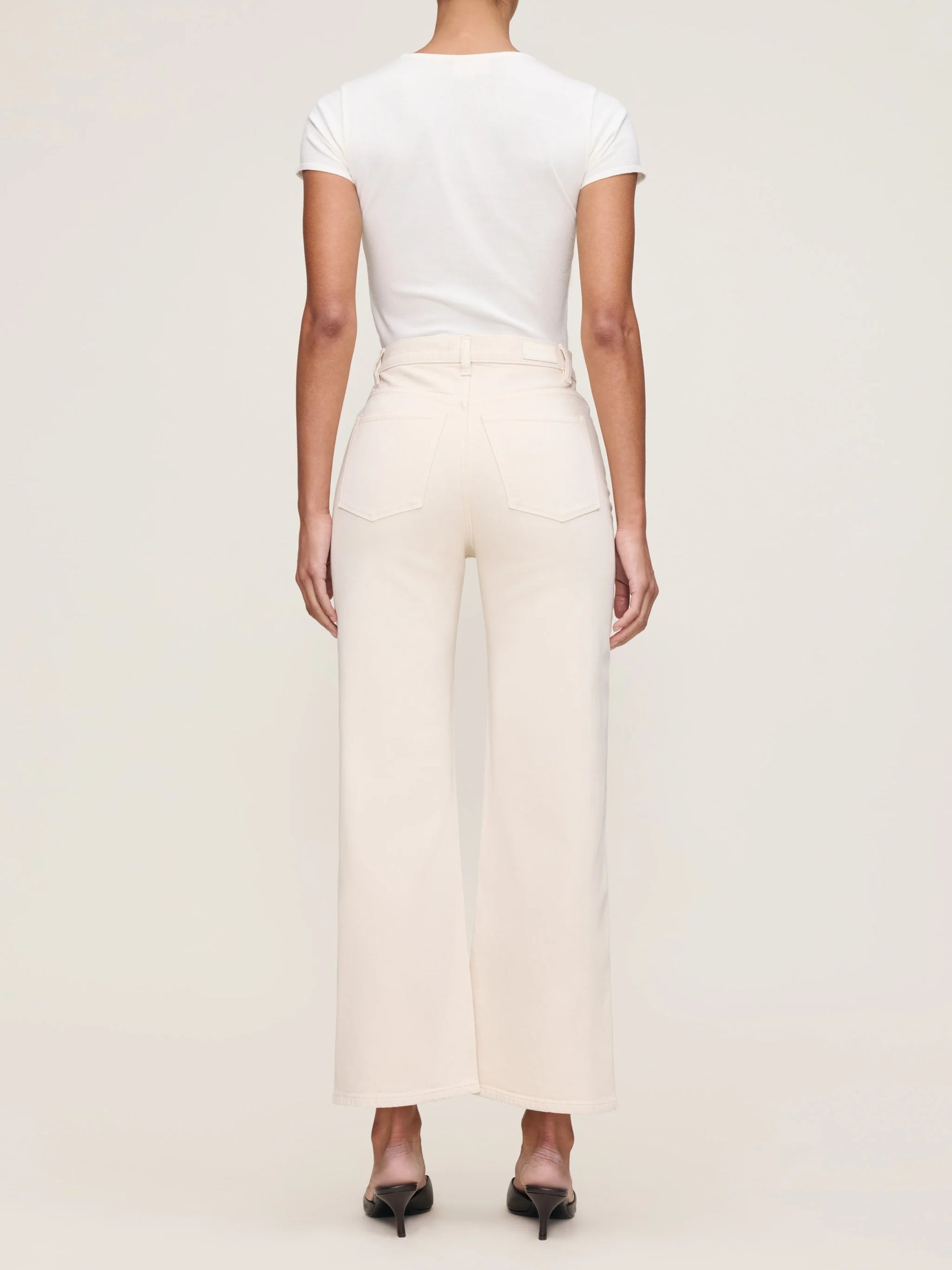 Flax is a warm, off-white denim. It features silver hardware, tonal stitching, a clean hem and an ecru back patch.