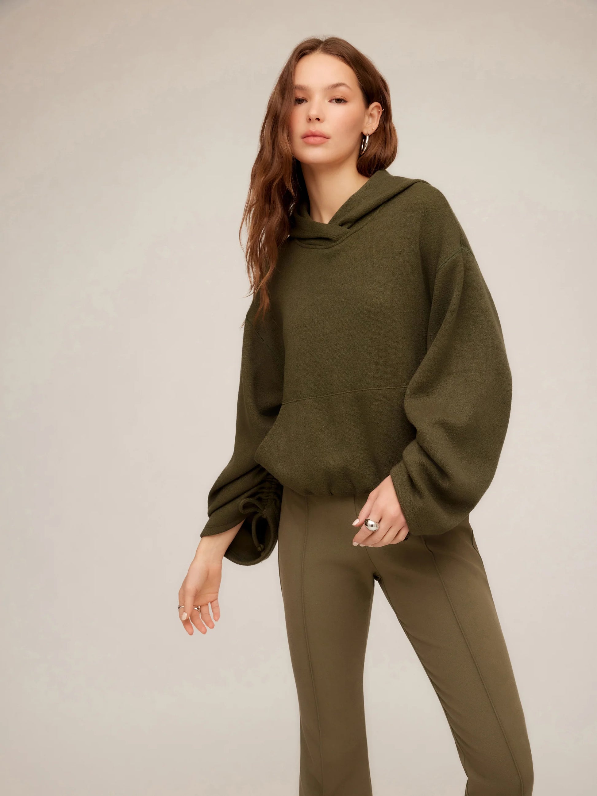 Made from soft double brushed knit, this pull-on hoodie features a relaxed, oversized silhouette with a crossover hooded neckline and long, exaggerated bubble sleeves. A front kangaroo pocket adds cozy utility, while adjustable drawstring ties—hidden discreetly underneath the arms—and a cinched hem create a modern, balanced finish.